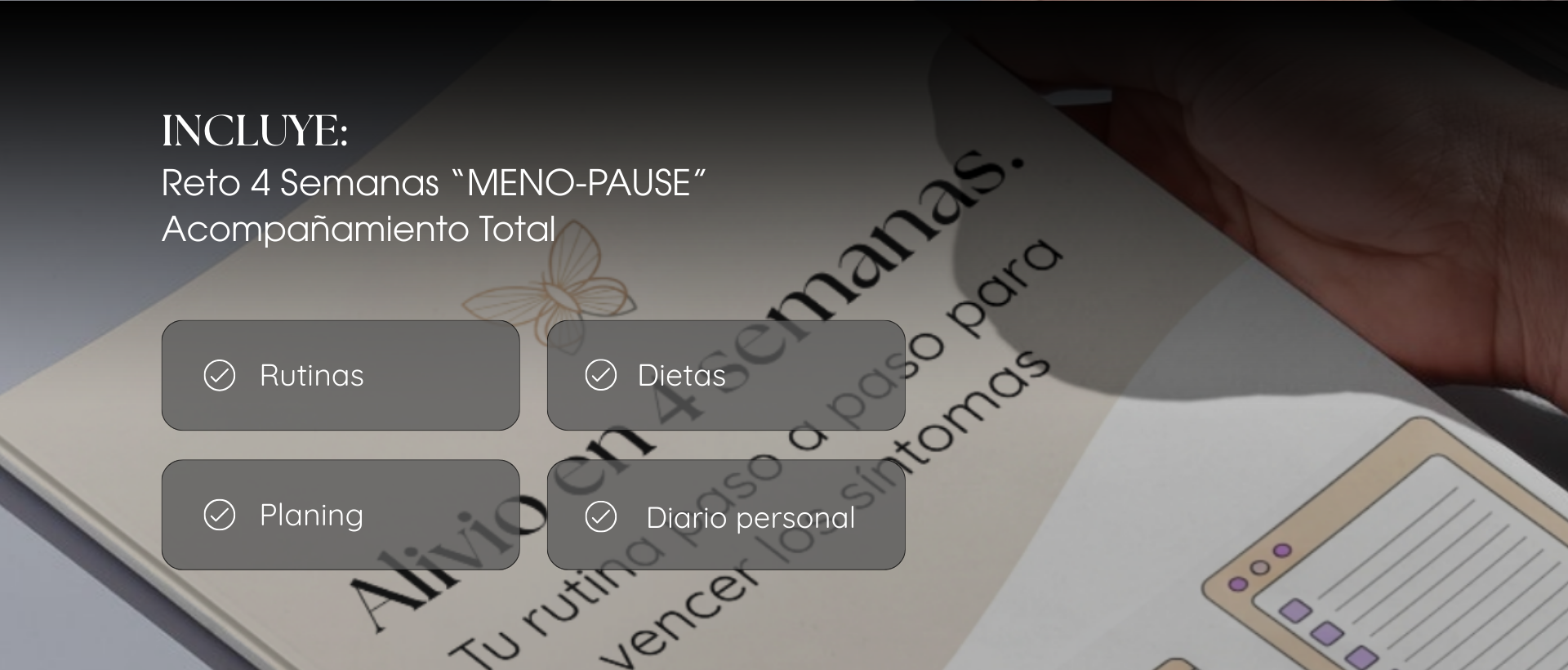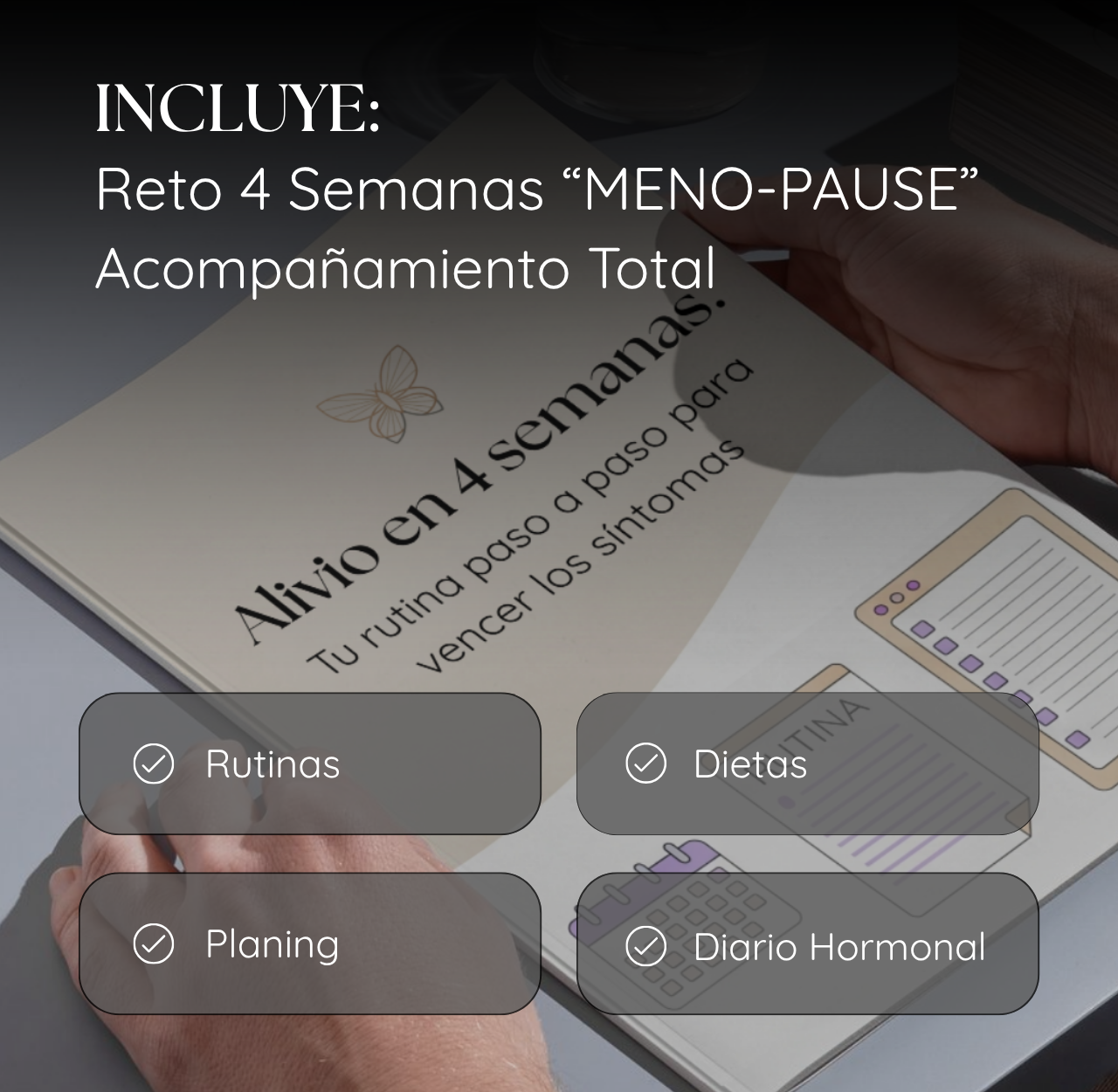 El plan descargable 4 semanas incluye rutinas de ejercicio sencillas para realizar en casa, menús de alimentación sugeridos, consejos prácticos y un calendario MENO-PAUSE para optimizar tus resultados y sentirte renovada en un mes.